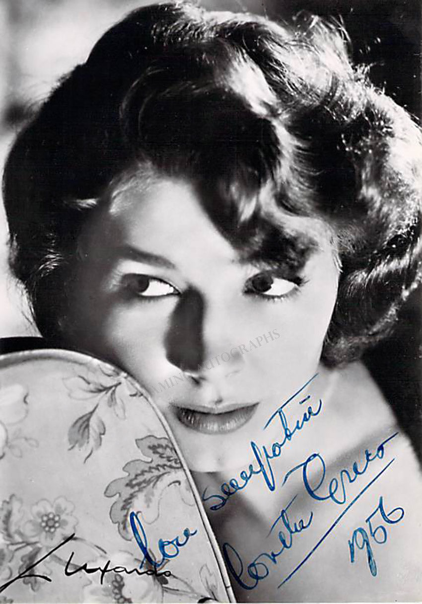 Black-and-white photograph signed by her with a short sentiment dated 1956, shown in a film. Size is 4 x 5.75 inches, in excellent condition.