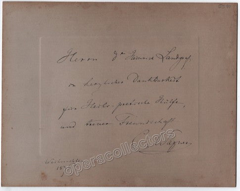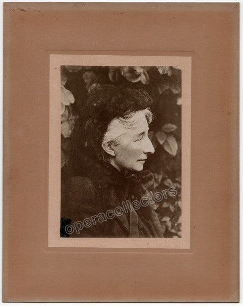 Cosima Wagner (1837-1930) was Richard Wagner´s second wife and daughter of composer Franz Liszt, together with Richard Wagner she co-founded the Bayreuth Festival and devoted her life after her husband´s death to directing the festival (which she ran for 22 years) and his Music. Large photograph of her, signed and dated on verso, inscribed to Heinrich Landgraf expressing gratefulness for his help and true friendship. Dated in Christmas, 1896 (and Cosima´s birthday, she was born on December 24th, 1837). Size is 9.25 x 11.75 inches (total mat size), actual image is 5.5 x 7.5 inches. In very good condition