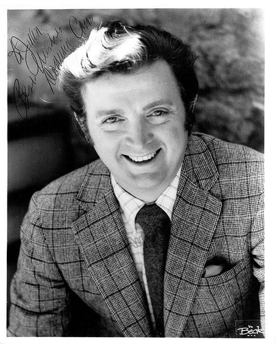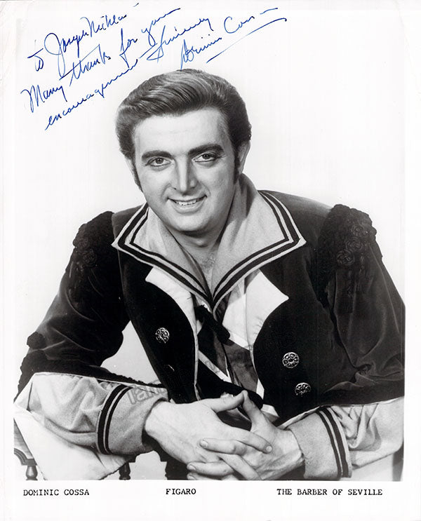 Signed photograph, shown as Figaro in Rossini's Barbiere di Siviglia, inscribed. Size is 8 x 10 inches, several small creases and bends, otherwise in very good condition.