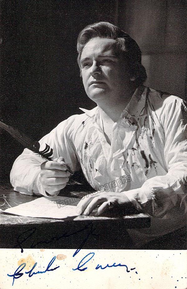 English dramatic tenor (1919-1997), signed photo postcard, shown as Cavaradossi in Puccini's Tosca. Stamped on verso by photographer Houston Rogers, London. Size is 3.4 x 5.25 inches, small stains near bottom of photo, discount reflected in price.