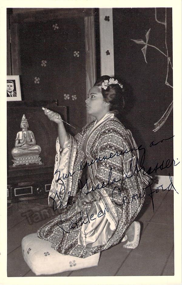 Signed photo postcard, shown in the title role in Madama Butterfly. Inscribed. Size is 3.5 x 5.5 inches
