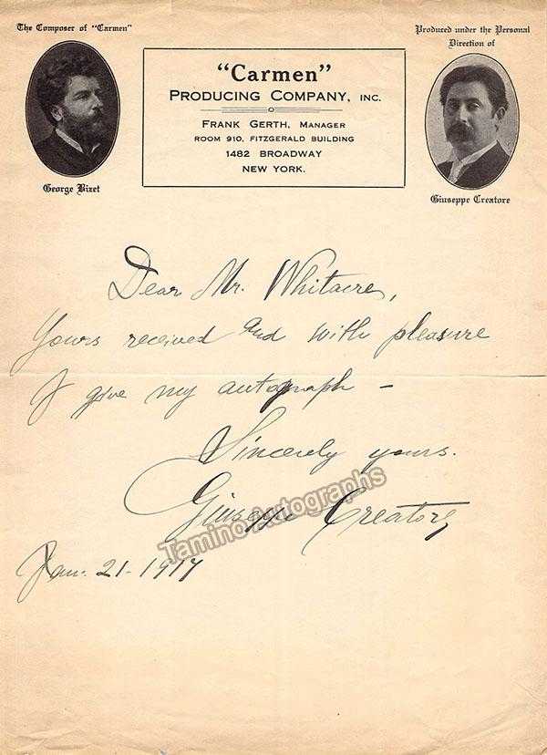 Italian bandmaster (1871-1952) who rivaled John P. Sousa. Autograph note signed with a picture of him on letterhead, advertising a production of Carmen, dated in 1917. 1 Page, size is 8 x 11 inches, folds, in very good condition.
