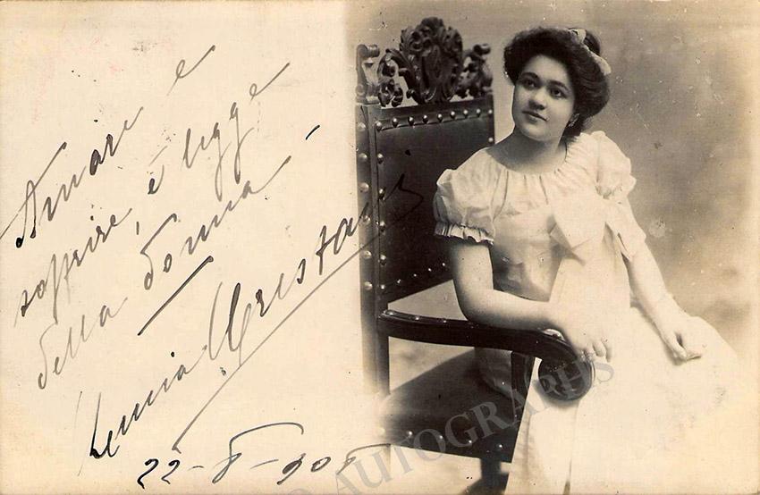Italian soprano (1886-1972), signed photo postcard, shown as herself or possibly in role, inscribed and dated in 1909. Size is 3.5 x 5.5 inches, in excellent condition.