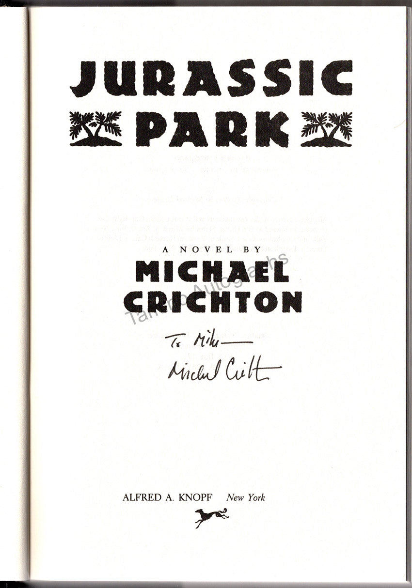 His book "Jurassic Park", one of his bestseller, published by Alfred A. Knopf, New York, first edition, 1990, signed by Crichton on the full title page. Size is 6.5 x 9.5 inches, 400 pages, hardcovers, dust jacket, some wear and minor crack on the dust jacket, otherwise in very good condition.