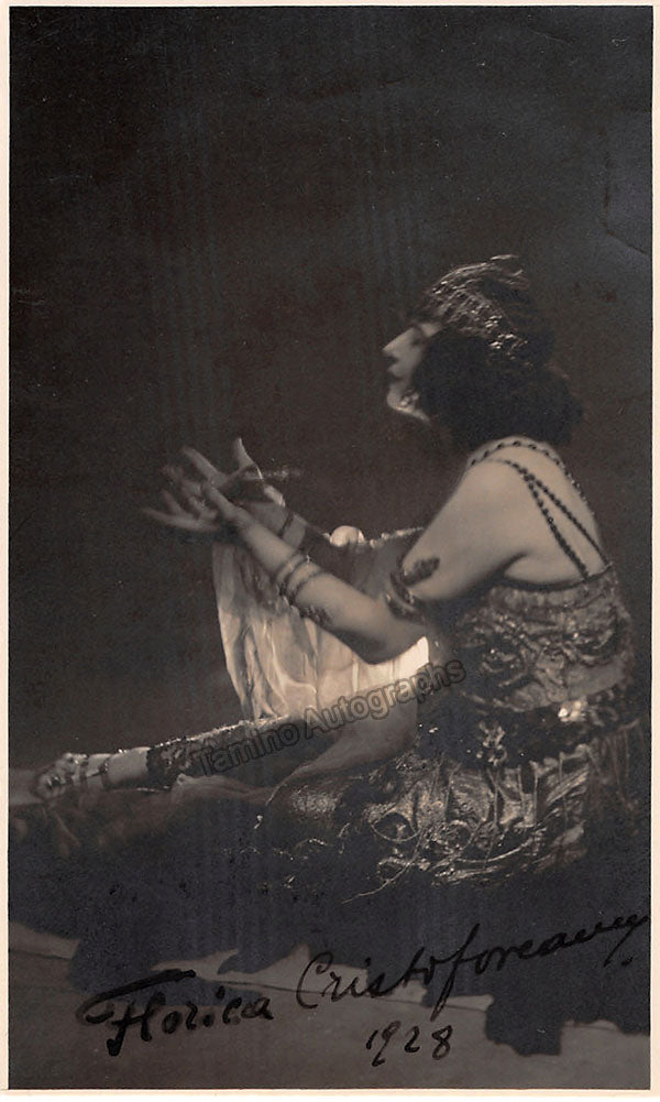Romanian soprano (1886-1960), signed postcard photograph, shown in role (possibly Richard Strauss's Salome), dated in 1928. Size is 3 x 5 inches, some silvering and mounting traces on verso, otherwise in very good condition.