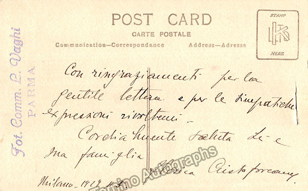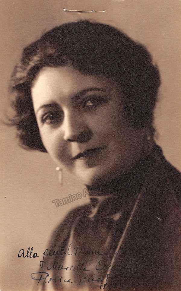 Romanian soprano (1886-1960), signed postcard photograph, shown as herself, signed and inscribed on both front and verso, dated in Milan in 1928. Stamped on verso by photographer L. Vaghi, Parma. Size is 3.5 x 5.5 inches, very small crack near the top, otherwise in excellent condition.
