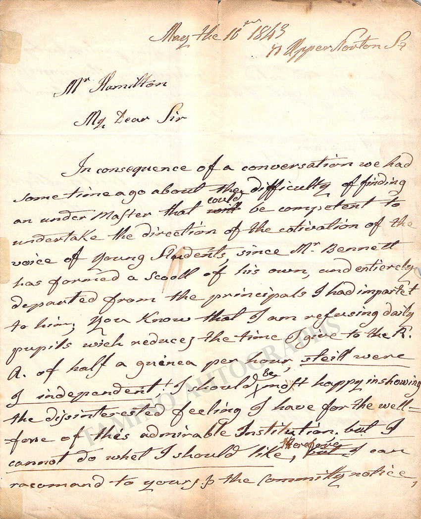 Autograph letter signed, dated in 1843, 2 pages of a 4 page folded document, written in English. Each page is 7.5 x 9 inches, clear and bold handwriting, slight rips and tears, otherwise in very good condition