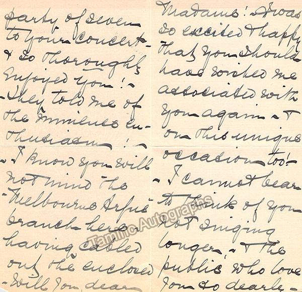 British contralto (1874-1929), autograph letter signed on two sets of folded four-page documents, 7 pages of text, dated in 1906. Written to the great soprano Adelina Patti. Size of each document is 3.5 x 6.75 inches, in excellent condition.