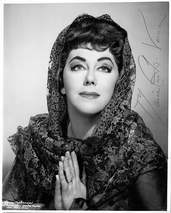 Signed photograph, shown in role, signed as 'Maria Curtis-Verna'. Printed signature on front of photographer Louis Melancon, Metropolitan Opera, New York. Size is 8 x 10 inches, some creases and bends, otherwise in excellent condition.