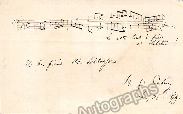 Autograph music quote signed, dated by him in 1879, inscribed, from an unknown piece. Size is 7 x 4.5 inches, mounting traces on verso, in excellent condition