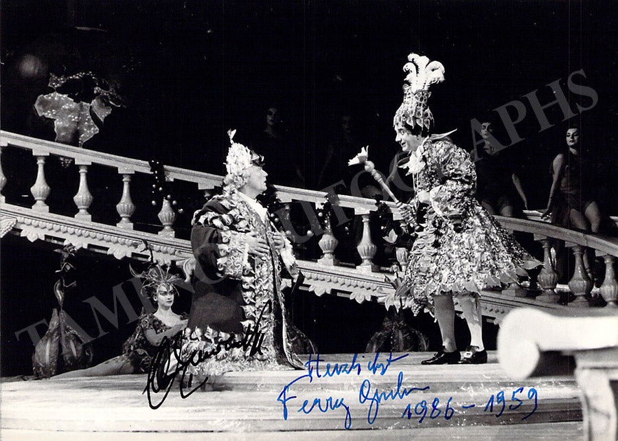 Fine black-and-white photo postcard signed by both artists, shown in Haydn's opera "Il Mondo della Luna". Size is 5.7 x 4.1 inches, in excellent condition.