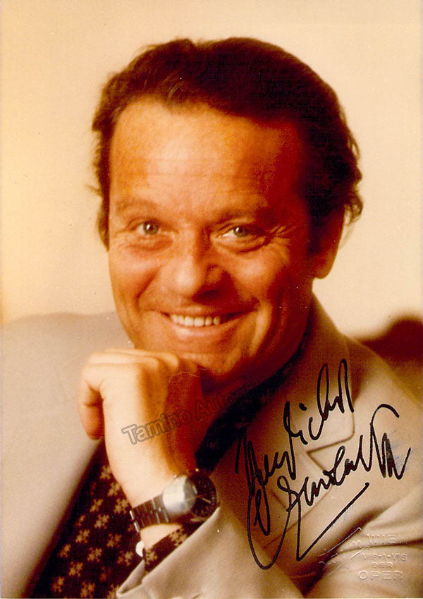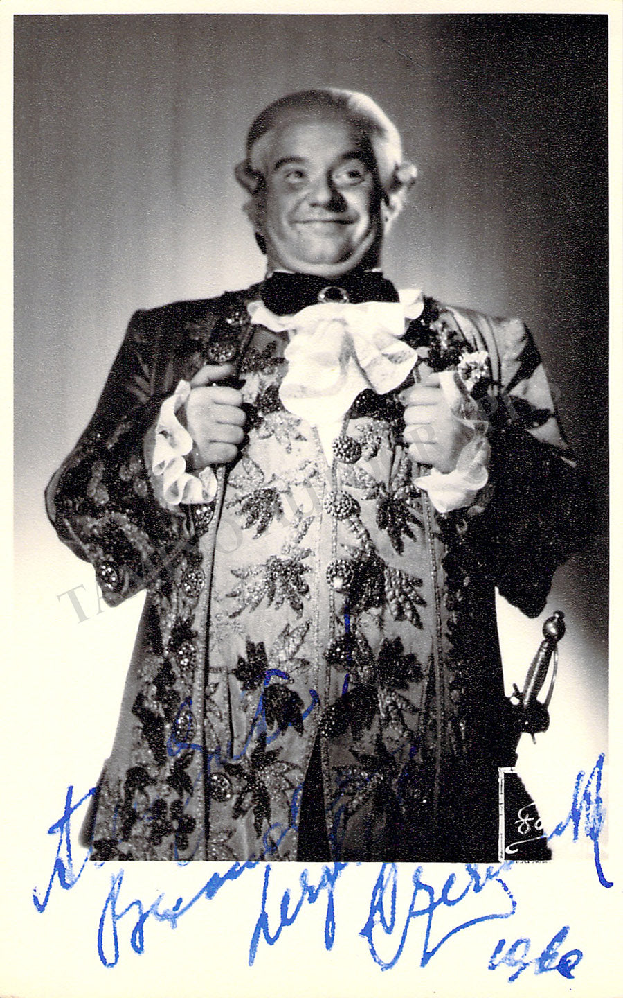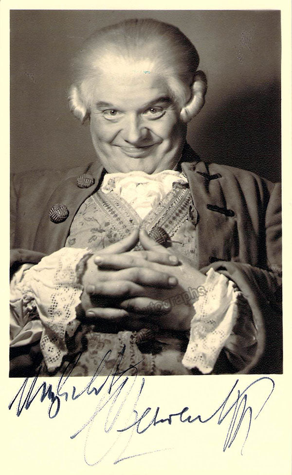 Signed photograph, shown in role (most likely Baron Ochs in Richard Strauss's Der Rosenkavalier), inscribed, and dated in 1960. Stamped on verso by Fayer photo studio, Vienna. Size is 3.25 x 5.25 inches, in excellent condition.
