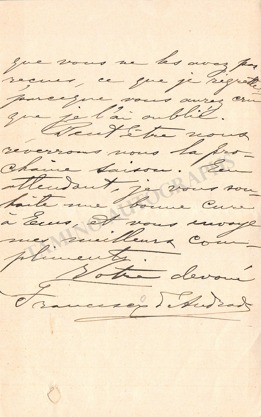 Portuguese baritone (1856-1921), who sang leading roles in opera houses throughout Europe. Autograph letter signed, 2 pages, written in French and sold untranslated. Size of each page is 4.5 x 7 inches, small bullet holes at the bottom of each page and several small creases and folds, otherwise in very good condition.