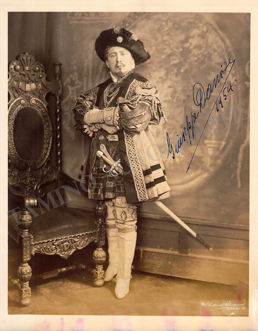 Prominent Italian baritone (1882-1963), signed photograph, shown as Don Carlo in Verdi's Ernani, dated in 1954. Printed signature on front and stamped on verso by Underwood and Underwood photographers, New York.  Size is 7.75 x 10 inches, some rust and mouting traces on verso, otherwise in very good condition.