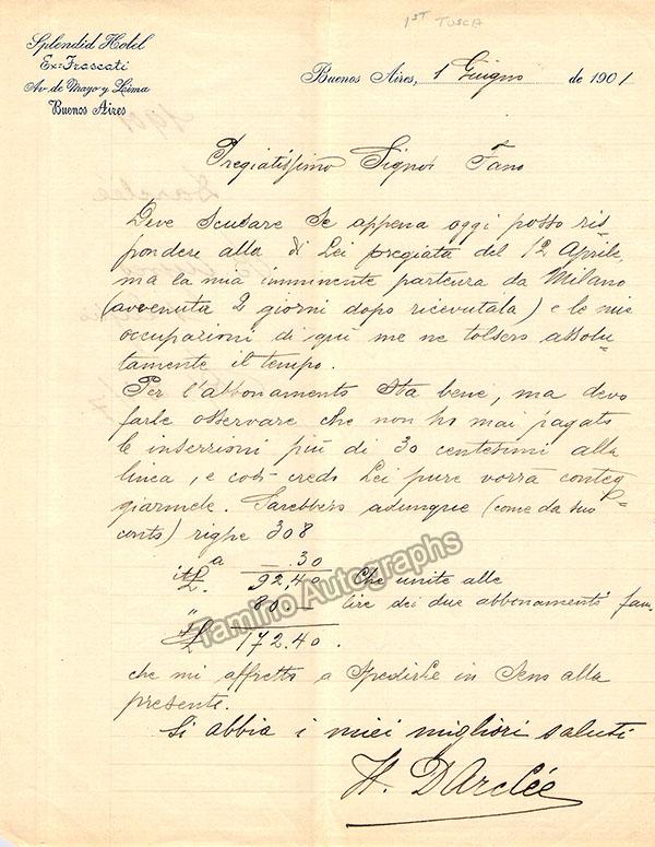 Romanian soprano (1860–1939), famous for creating the role of Tosca at the world premiere at Teatro Costanzi in Rome on January 14th, 1900 - a national event in Italy. Autograph letter signed, written on the stationary of the Splendid Hotel, Buenos Aires, dated in 1901. Written in Italian, sold untranslated. Size is 8 x 10.25 inches, clear handwriting and bold signature. Very slight crease on upper left, otherwise in excellent condition.