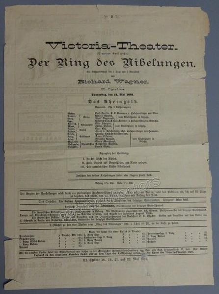 Der Ring des Nibelungen in Berlin, 12th May 1881. Performance of Das Rheingold. With Anton Seidl conducting. With Emil Scaria, Heinrich Vogl, Julius Liebau, Franz von Reichenberg - Program page (not full program), 9.25 x 13 inches, some cracks, otherwise in very good condition