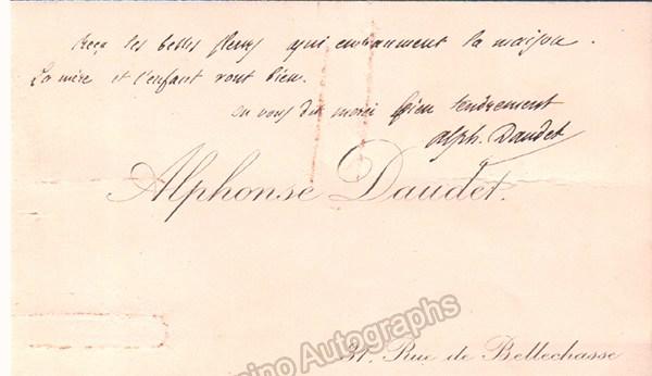 French novelist (1840-1897), signed calling card with a short message in French. Size is 3.25 x 2.25 inches, minor rust stains, otherwise in very good condition.