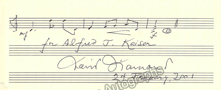 ALSO INCLUDED is a 3-bar music quote from an unknown piece signed and inscribed by him in 2001. Size is 8.7 x 3.6 inches, in very good condition.