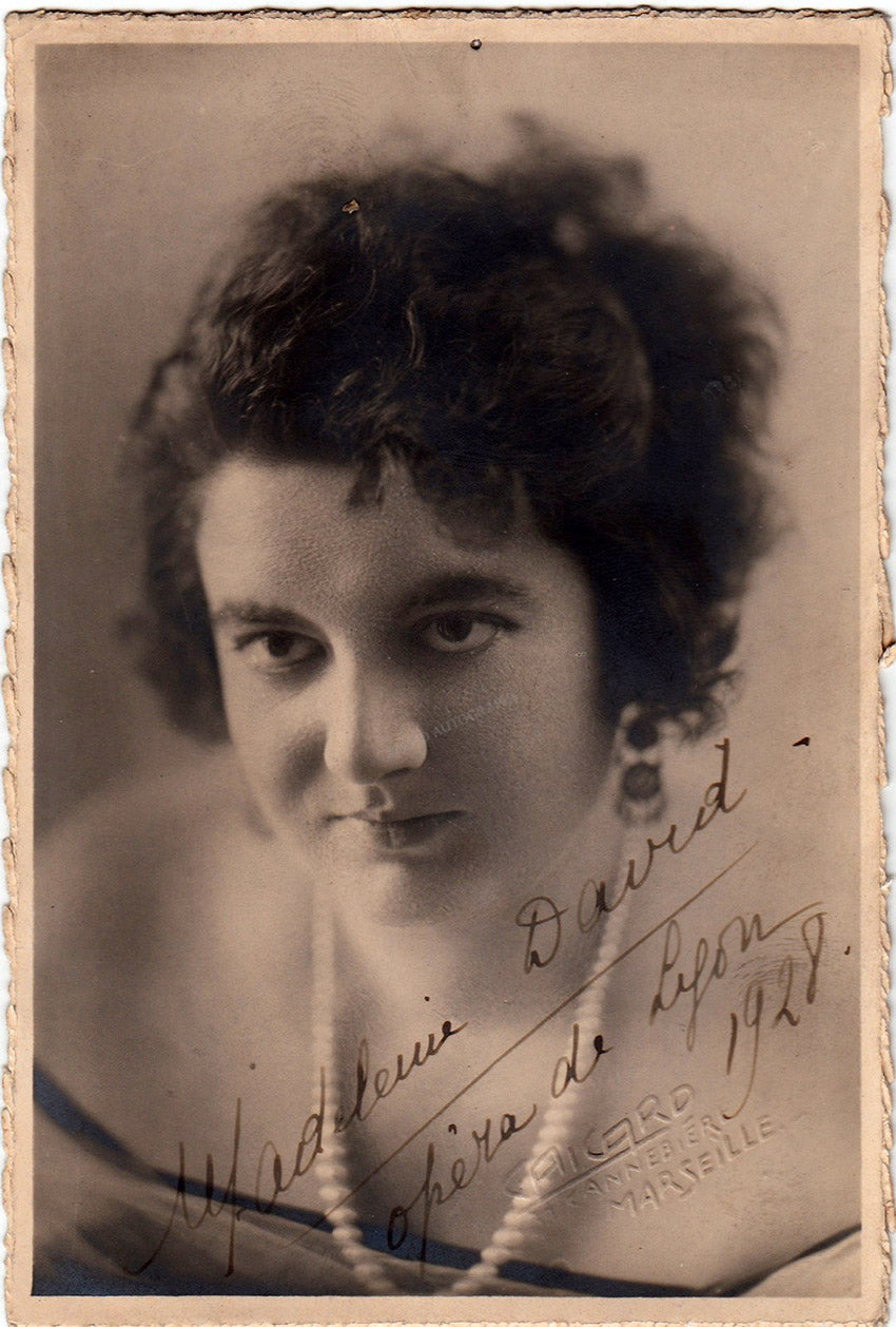 French soprano, signed photograph, shown as herself, dated in 1928. Blind stamped on front by photographer. Size is 4 x 5.75 inches, jagged edges, otherwise in good condition.