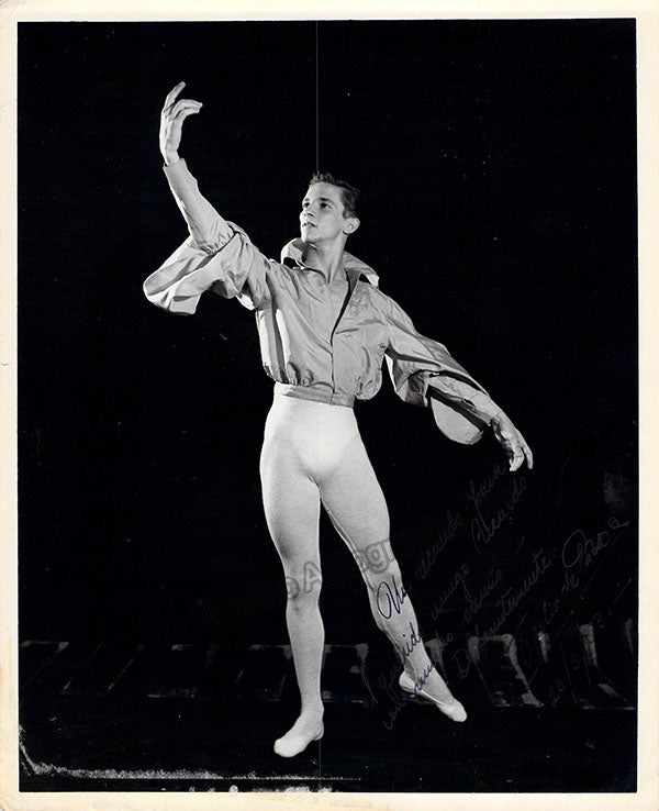 Venezuelan dancer, choreographer, and dance teacher (b. 1932), active throughout Latin America from the 1950s until the turn of the century. Signed photograph, shown in performance, inscribed with short sentiment, dated in 1953. Stamped on verso by Fashion Photography studio. Size is 8 x 10 inches, some bends and rust near bottom of front side, otherwise in very good condition.
