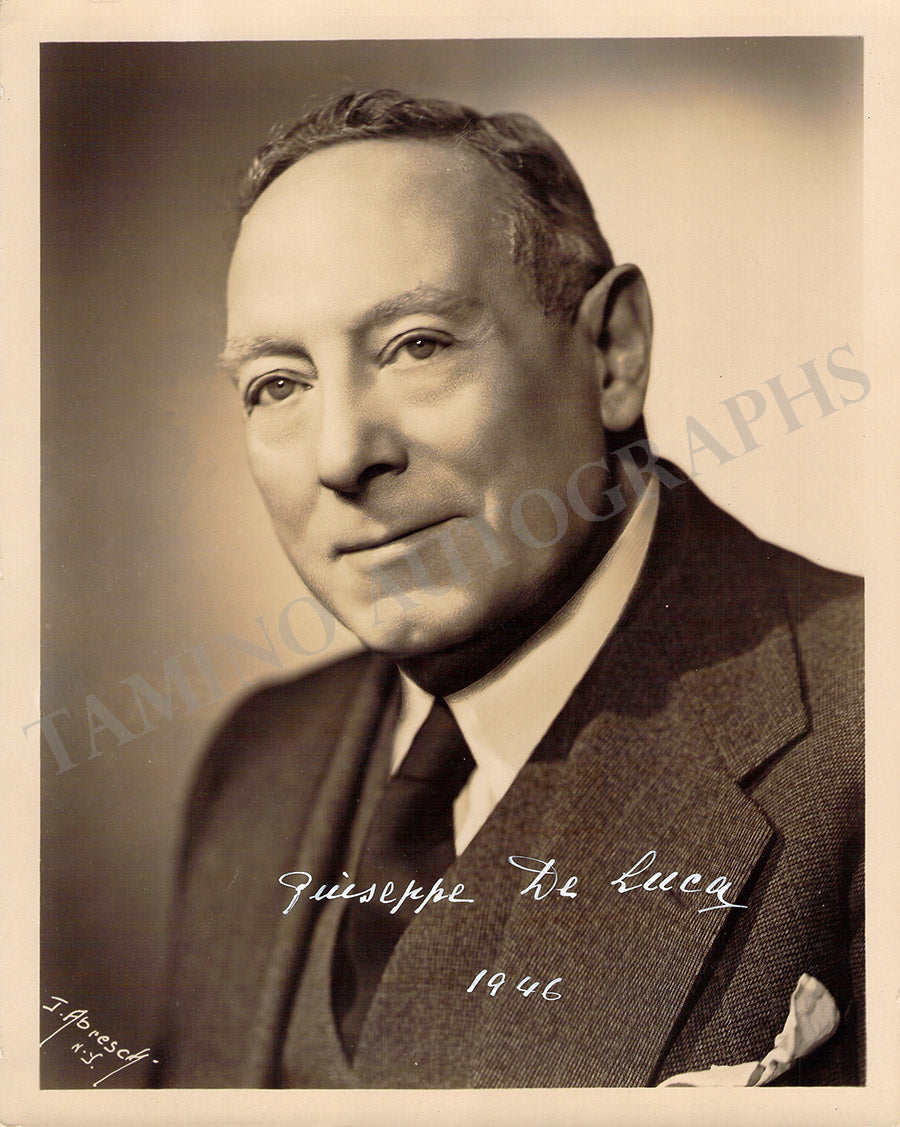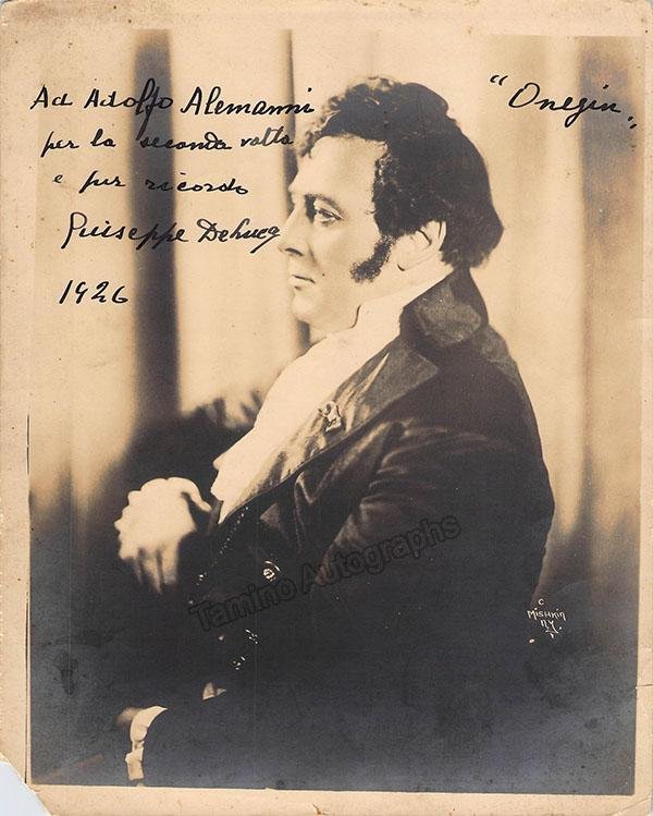 Beautiful black-and-white photograph signed and inscribed by him with a short sentiment dated in New York, 1946, shown as Giorgio Germont in Verdi's 'La Traviata'. Size is 7.7 x 9.75 inches, some creases, loss of paper in two corners, otherwise in very good condition.