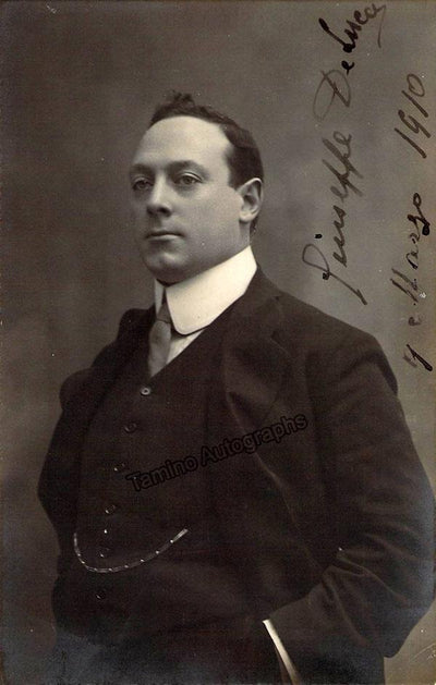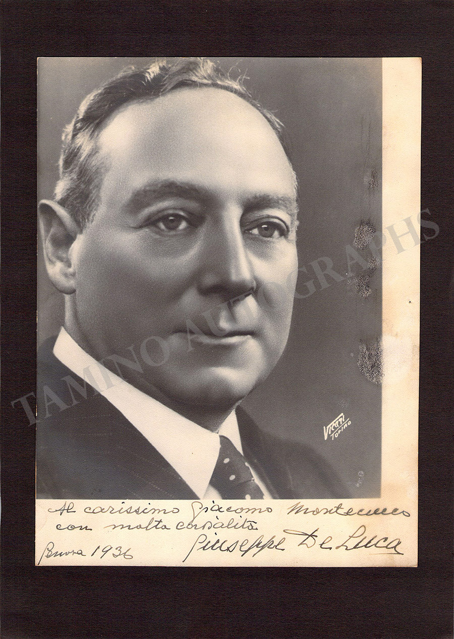 Fine black-and-white photograph mounted on cardboard signed and inscribed by him with a short sentiment dated in Genoa, 1936; photo by Vicari (Turin). Size is 7 x 9 inches approx., some traces of humidity over the borders, in overall very good condition.
