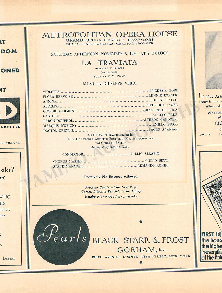 ALSO INCLUDED is an unsigned clip from a program for a performance of Verdi's 'La Traviata' at The Metropolitan Opera in November 1930 featuring Giuseppe de Luca as Giorgio Germont.