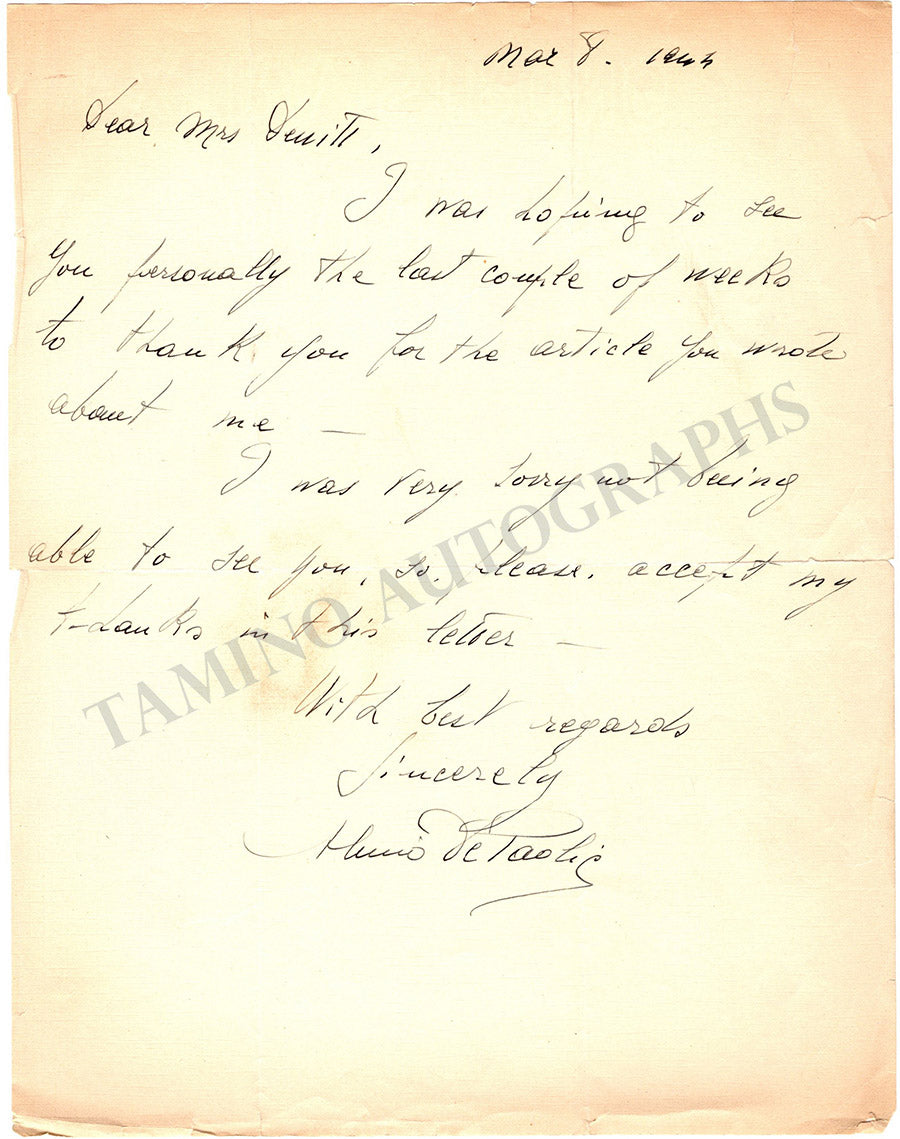 Italian tenor (1893-1964), autograph note signed, 1 page, written in English. Size is 8.5 x 11 inches, 1 fold with small tear on the right and several creases on bottom and sides, otherwise in very good condition.