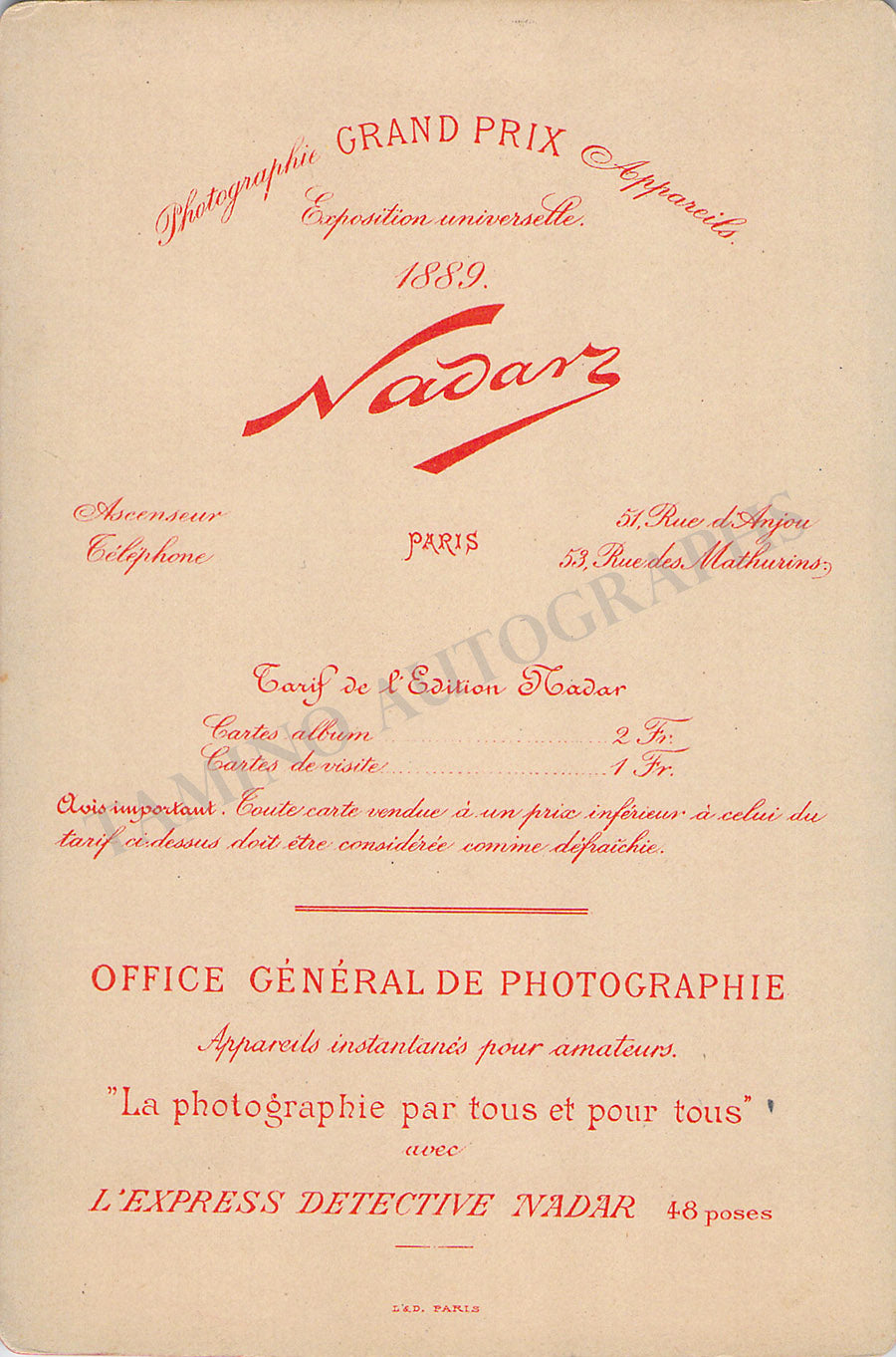 Set of two very attractive unsigned cabinet photographs, one of each artist: both shown as themselves by photographer Felix Nadar, Paris. Both photos' size is 4.25 x 6.5 inches and are in excellent condition. Not sold separately.