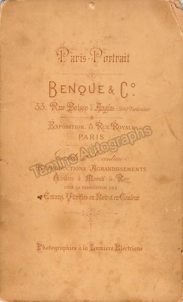Beautiful, signed cabinet photo, shown as himself, dated in 1891. Photo by Benque and Co., Paris. Size is 5.25 x 8.5 inches, minor damage on corners, otherwise in very good condition.