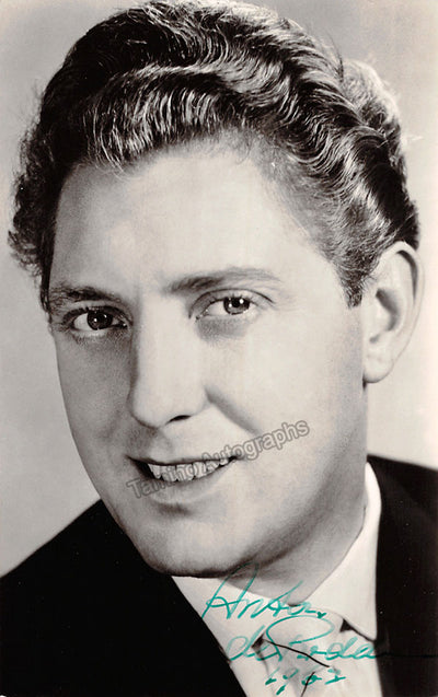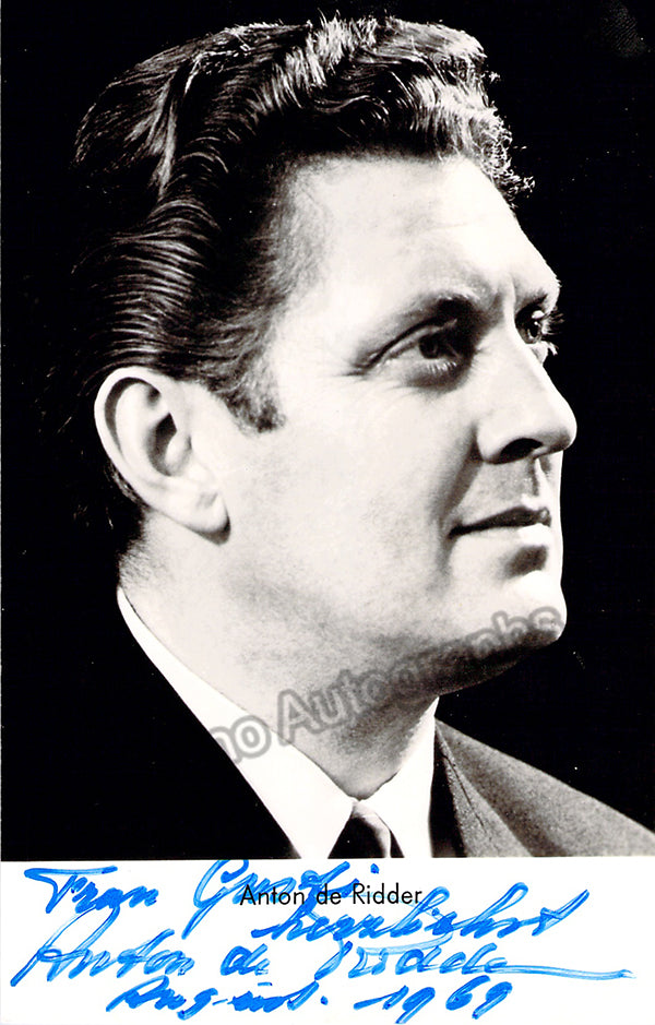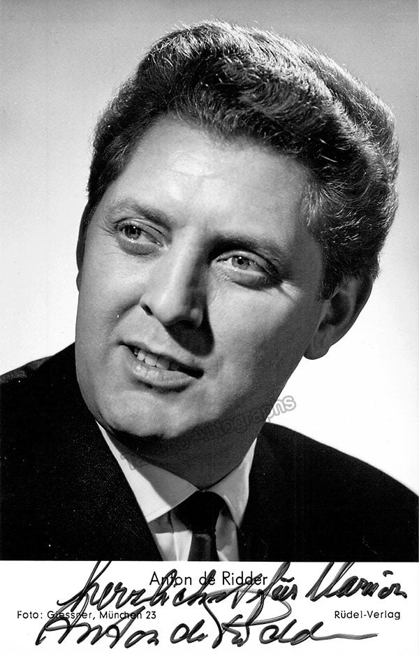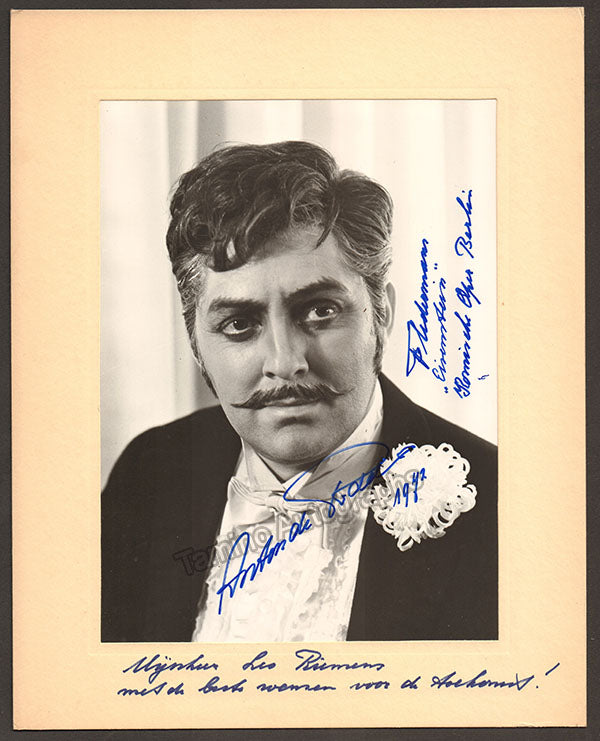 Signed photo on a mat, shown in role in Johann Strauss's Die Fledermaus, inscribed and dated in 1972. Stamped on verso by photographer Clemens Kohl, Berlin. Total item size is 9.4 x 11.8 inches (actual photo is 6.5 x 8.9 inches), in excellent condition.