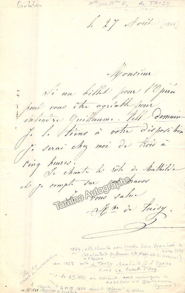 French soprano, also known as "Mademoiselle de Taisy", a frequent performer at the Paris Opera  Comique. Autograph letter signed, 1 page, dated in 1864, written in French and sold untranslated. Signed as "Mademoiselle de Taisy." Size is 5.25 x 8 inches, some biographical information penciled in below the text, in very good condition.