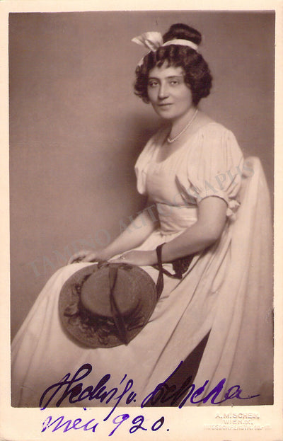 Signed postcard photograph, shown as Antonia in Offenbach's Les Contes D'Hoffmann, dated in Vienna in 1920. Blind stamped on front by A.M. Schein photographers, Vienna. Size is 3.25 x 5.25 inches, in excellent condition.