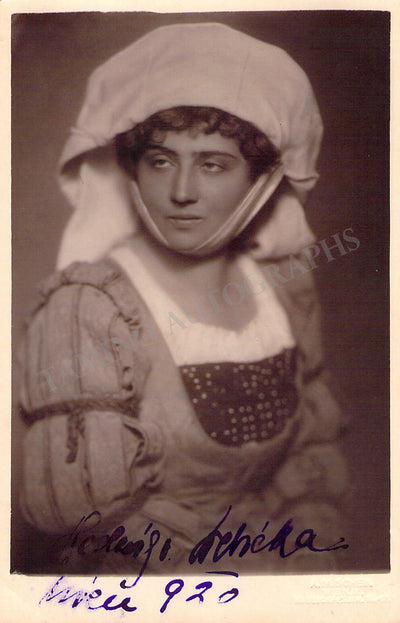 Signed postcard photograph, shown as Eva in Wagner's Die Meistersinger, dated in Vienna in 1920. Blind stamped on front by A.M. Schein photographers, Vienna. Size is 3.25 x 5.25 inches, in excellent condition.
