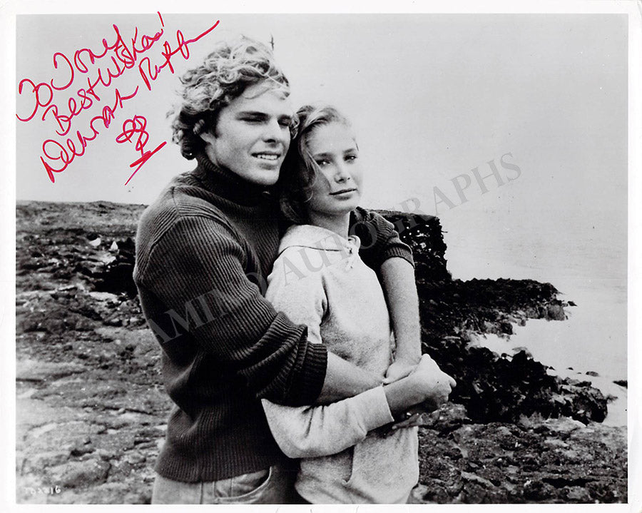 Beautiful black-and-white promo photograph signed and inscribed by her with a short sentiment, shown next to Joseph Bottoms in the film The Dove (1974). Size is 10 x 8 inches, in excellent condition.