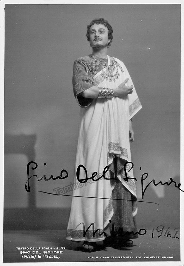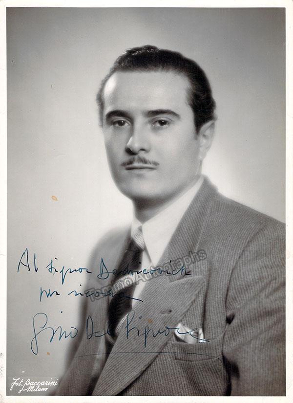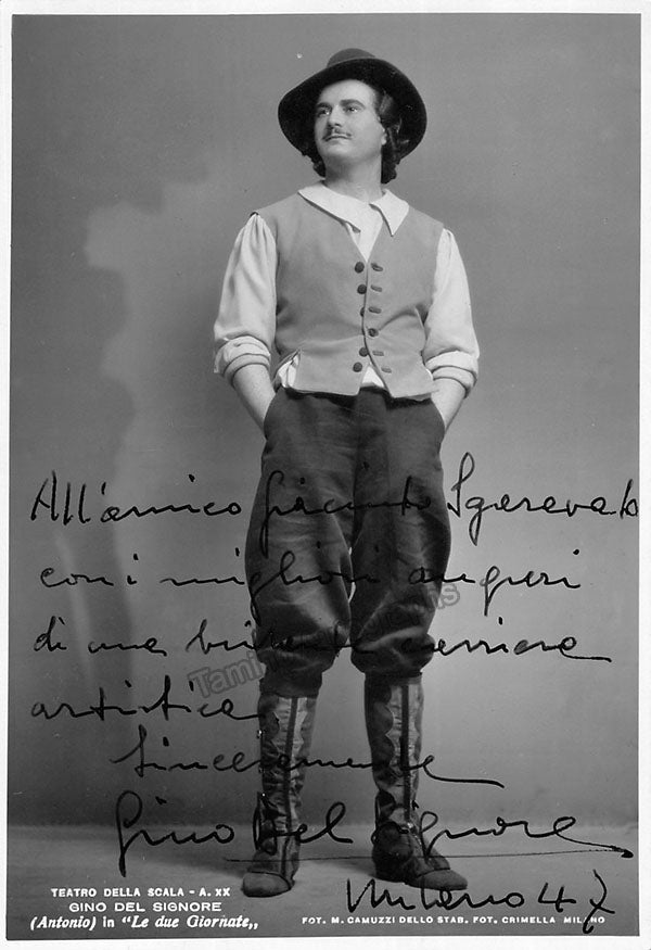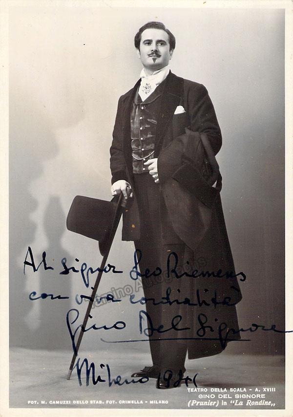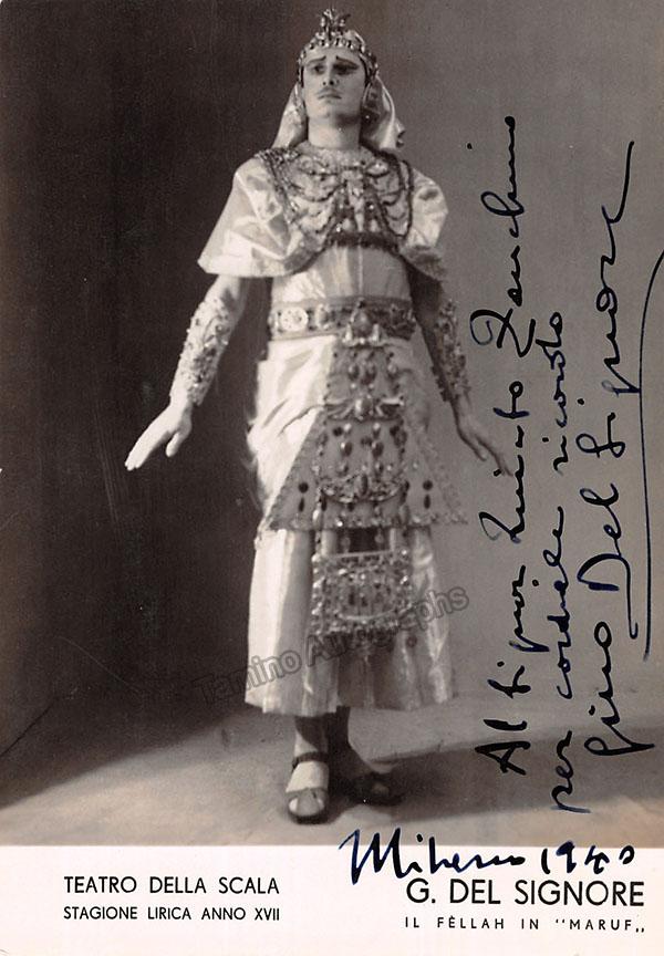 Signed photograph, shown as Antonio in Luigi Cherubini's Le Due Giornate, inscribed with short sentiment, dated in Milan in 1947. Photo by M. Camuzzi, La Scala, Milan. Size is 4 x 5.75 inches, mounting traces on verso, otherwise in excellent condition.