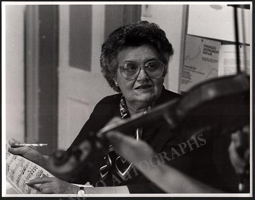 Original Photo, signed on verso by photographer Jim Arkatov, dated in 1988. The American violin instructor is shown teaching a student. Photo is 14 x 11 inches, in excellent condition.