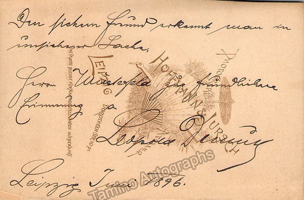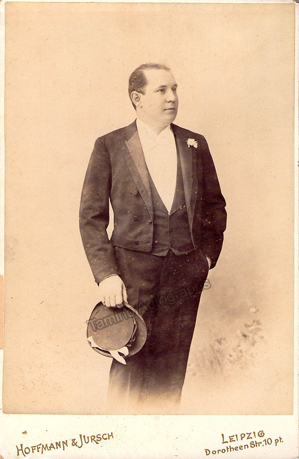 Signed cabinet photograph, shown as himself, signature and inscription on verso, dated in Leipzig in 1896. Photo by Hoffman and Jursch, Leipzig. Size is 4.25 x 6.5 inches, small creases on edges, otherwise in excellent condition.