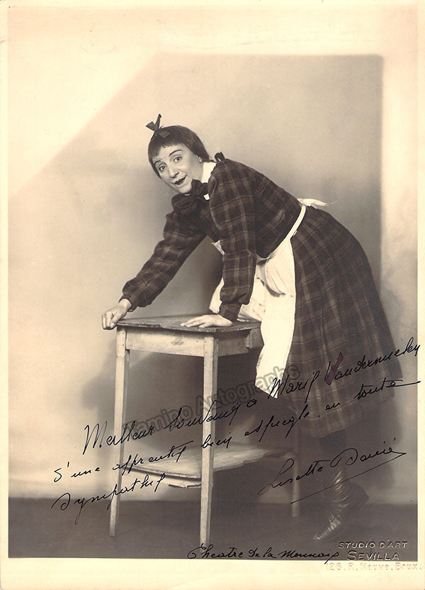 Belgian soprano (1903-?), who developed an important career at La Monnaie. Signed photograph, shown in role, inscribed. Blind stamped by photographer Studio Sevilla, Brussels. Size is 6.75 x 9.25 inches, in excellent condition.