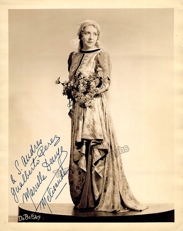 French soprano and actress (1896-?), signed photograph, shown as Melisande in Debussy's Pelleas et Melisande, inscribed. Bold handwriting and signature.  Stamped on verso by De Bellis photo studio, New York. Size is 8 x 10 inches, small creases and bends, otherwise in very good condition.