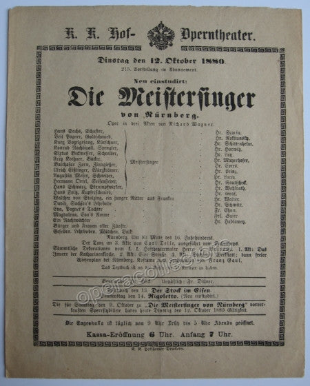 12. Oktober 1880 Die Meistersinger von Nurnberg (Wagner) Scaria Playbill 25 x 19,5 cm. Conductor not mentioned as usual in the 19th century, but it concerns Hans Richter