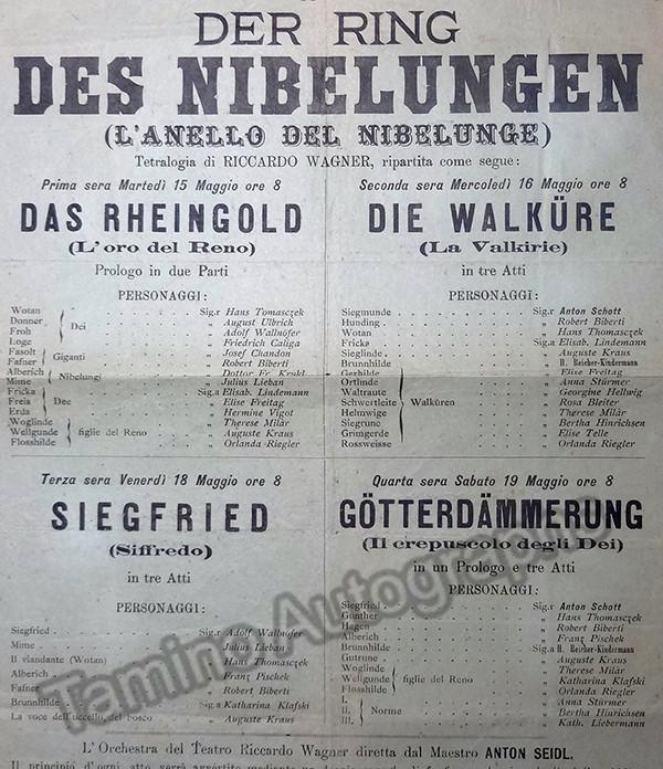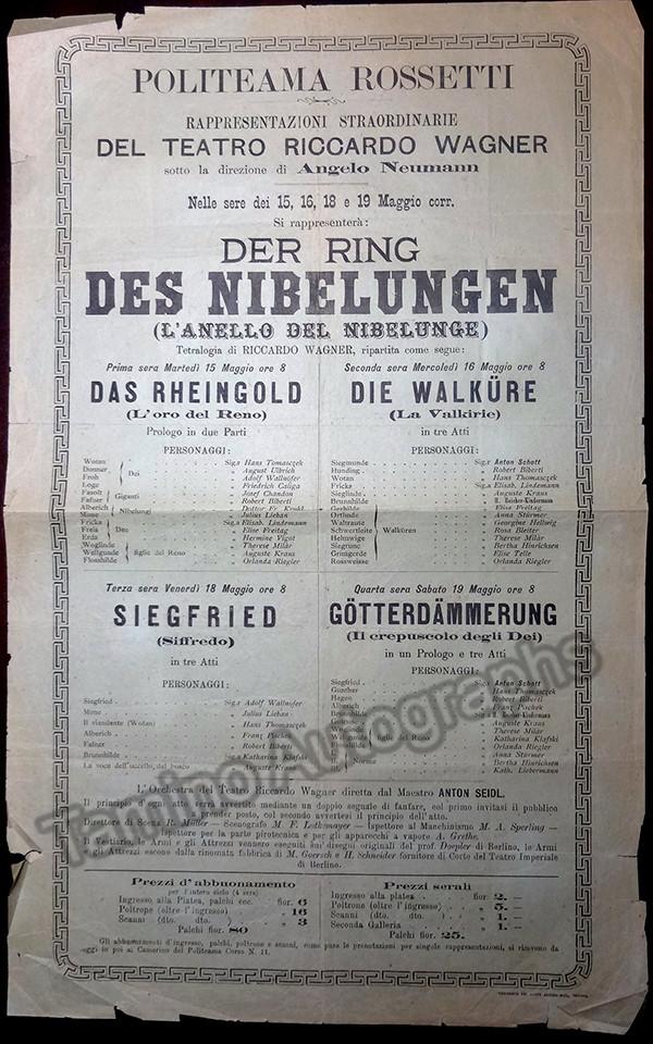 Angelo Neumann directs the production, with Anton Seidl conducting the orchestra, many famous German singers in the cast (see close-up photo). Teatro Politeama Rossetti in Trieste. Playbill is 9.4 x 15 inches in size, has folds and some minor cracks, but is in overall good condition. Rare!