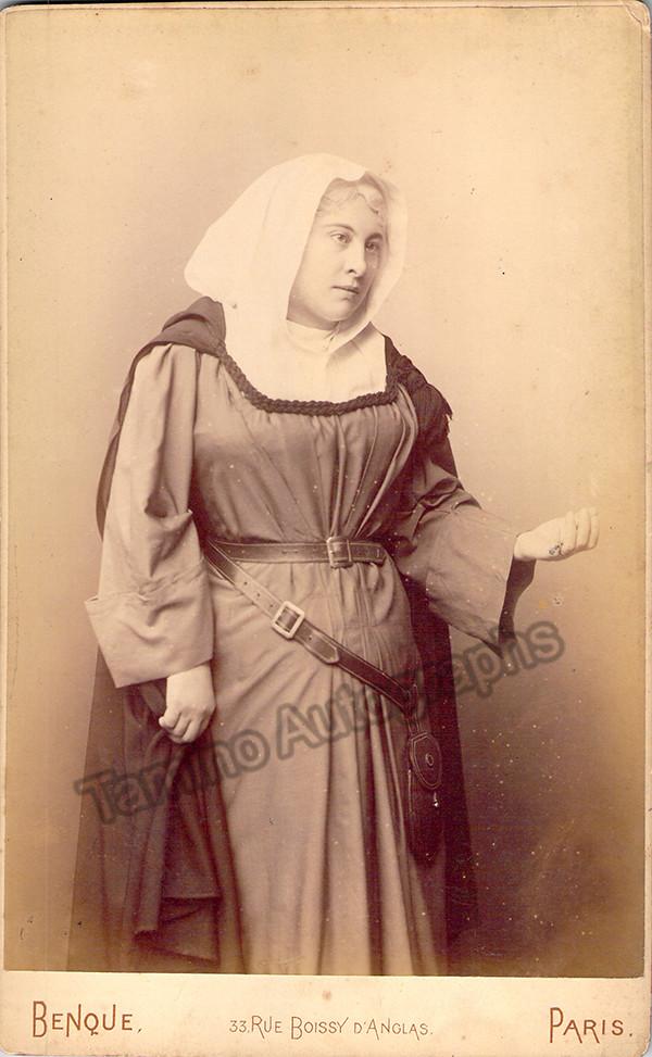 Large size cabinet photo of the French contralto (1857-1923), shown as Fides in Le Prophete. Photo by Benque, Paris, size is 5.25 x 8.5 inches, in excellent condition