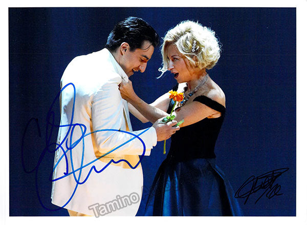 French star coloratura soprano (b.1965) and American tenor (b.1975), double signed photograph, shown as Violetta and Alfredo in Verdi's La Traviata. Size is 8 x 11.75 inches, in excellent condition.