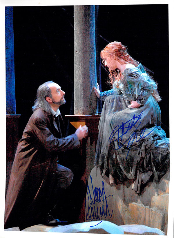 French star coloratura soprano (b.1965) and French bass-baritone (b. 1964), double signed phtograph, shown as Melisande and Golaud in Debussy's Pelleas et Melisande. Size is 8 x 10.75 inches, in excellent condition.