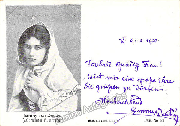 Signed postcard half-tone photograph, shown as Santuzza in Mascagni's Cavalleria Rusticana, dated in 1900. Bold handwriting and signature. Photo by Max Marcus, Berlin. Size is 3.5 x 5.5 inches, very small crease on bottom left, otherwise in excellent condition.
