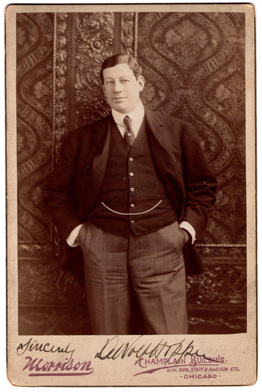 Original cabinet-style photograph by Morrison, Chicago, signed twice by the actor (on front and verso -where he inscribed with a short sentiment).  Size is 4.25 x 6.5 inches, in excellent condition