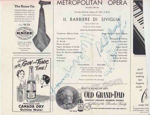 Signed clip from the cast page from a Met Program, 1951, performance of Il Barbiere di Siviglia. Signed by 4 singers, 10.25 x 9 inches, this are the 2 central pages from the program, trimmed over the right