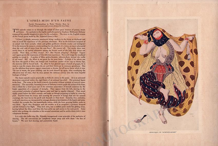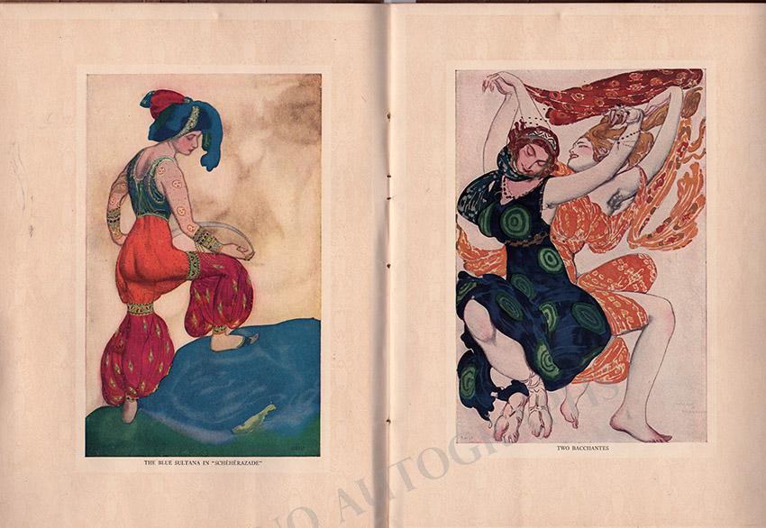 Serge Diaghilev´s Ballet Russe souvenir program, dark covers, with Vaslav Nijinsky in the main photo opposite to title page. Program lists the entire 1916 ballet season at the Metropolitan Opera, 9 x 12 inches, full program with all pages and covers, many beautiful illustrations (see some scans). Some damage on covers, otherwise in very good condition.