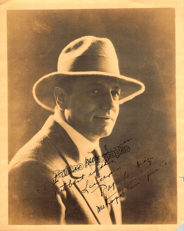 American tenor of Mexican ancestry (1883-1943), attractive vintage photograph, shown as himself, inscribed. Blind stamped on front by photographer E. Rasa, San Antonio, Texas. Size is 8 x 10 inches, small crease on top left and tear on bottom right, otherwise in excellent condition.